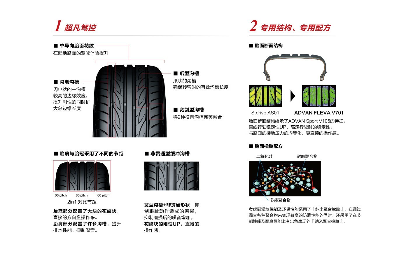 Yokahama ADVAN FLEVA V701不論是在市區街道、高速公路或者是山路上,都享有同等的車輛操控提升表現,更獲得歐洲A級濕地抓地力最高評價。 此外,此新胎更同時提供相當出色的行駛靜肅性,以及透過低滾動阻力設計進一步提升其環保節能效益。