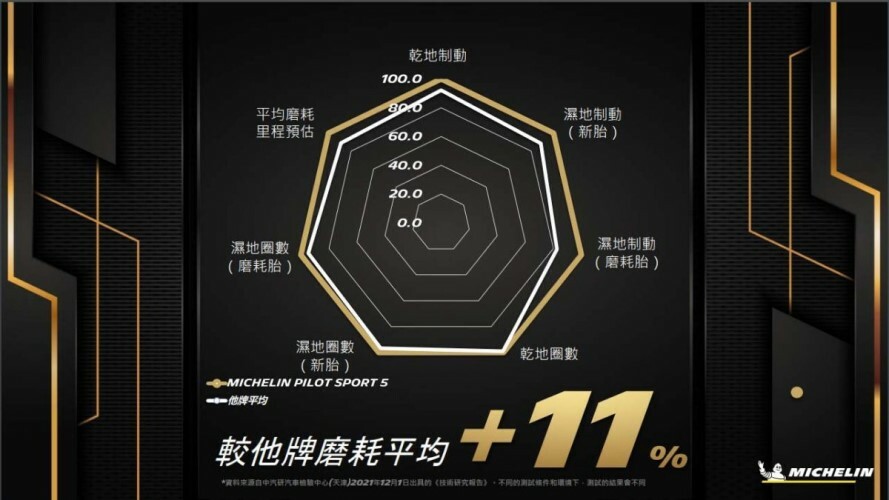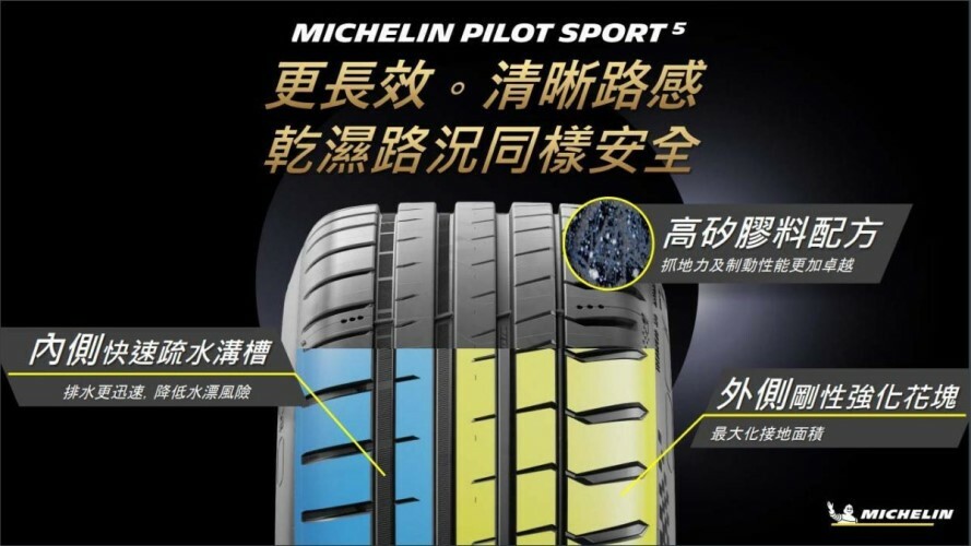 Pilot Sport系列一直以來都以抓地力還有出色的排水性能著稱。米芝連第五代運動型輪胎 Michelin Pilot Sport 5,不但在乾濕路面上提供最大限度的抓地力和製動能力,精確轉向提供高水平的駕駛反應性,還充分提高的使用壽命和持久的性能的設計配合光滑的外觀,是新一代運動型輪胎的最佳選擇。