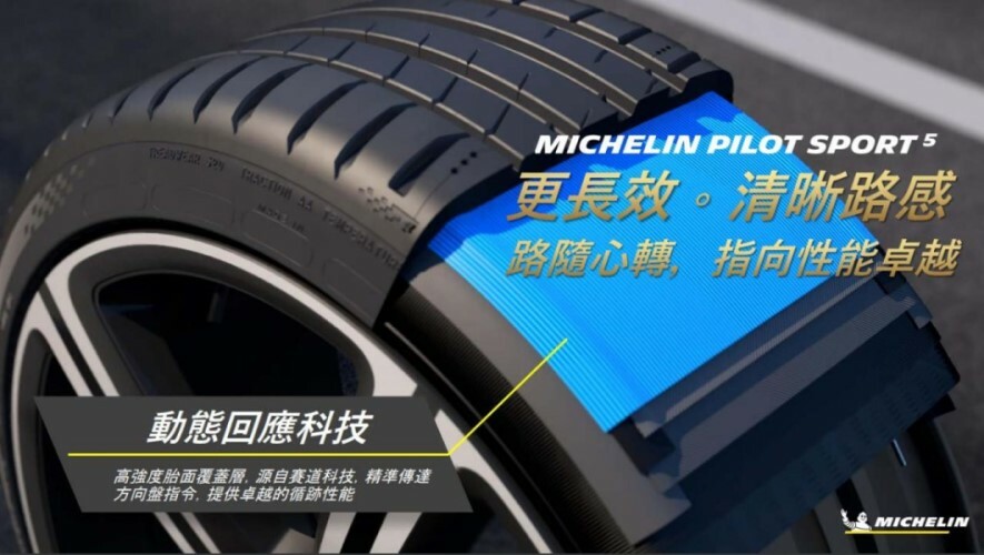 Michelin Pilot Sport 5 輪胎能讓駕駛者體驗高性能和最長使用壽命相結合的駕駛快感。駕駛時能充分感受轉向時輪胎與路面的反應,米芝蓮動態響應技術提供出色的反應性和駕駛精度。 MaxTouch 結構可確保超卓性能下駕駛更長時間,均勻分佈加速、制動和轉彎力,從而延長胎面壽命。