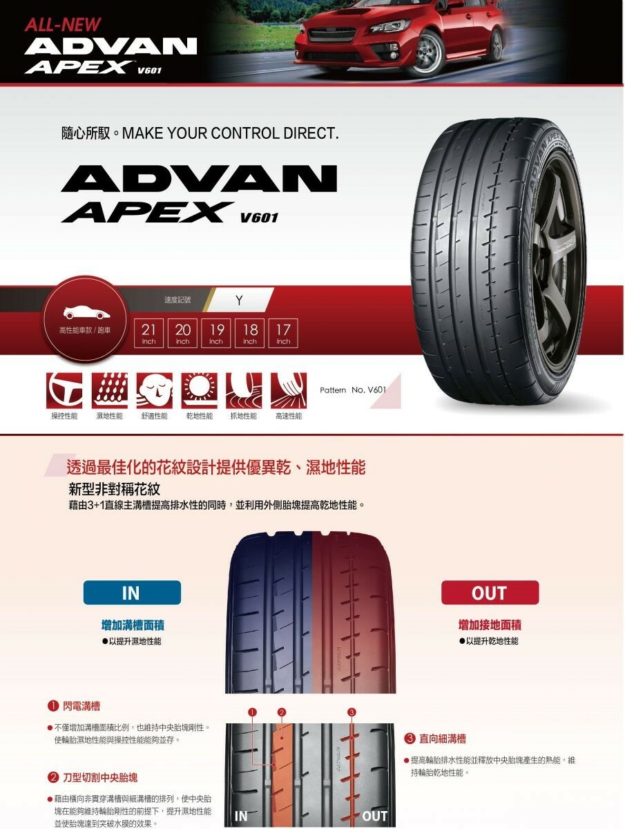 Yokohama ADVAN Apex V601 是一款高性能輪胎,適用於各種乘用車和跑車。它具有優異的操控性、抓地力和排水性能,能夠在幹燥和濕滑路面上提供卓越的性能和安全性。此外,V601 還具有降低噪音和提升乘坐舒適性的特點,使駕駛者能夠享受更寧靜和舒適的行車體驗。