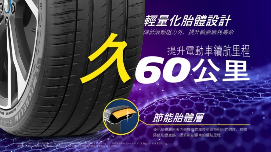 Michelin Pilot Sport EV 的輕量化設計,降低轉動慣量與滾動阻力的同時,高的剛性抑制型變及減少發熱並間接提升電動車續航表現。輪胎本身加入全新節能胎體層架構及全新材料科技提供更好的剛性表現又能有效降低胎體重量,且強度的升級也有助減少因胎體型變產生的熱能、近一步降低輪胎耗損並間接為車輛創造良好的續航表現。