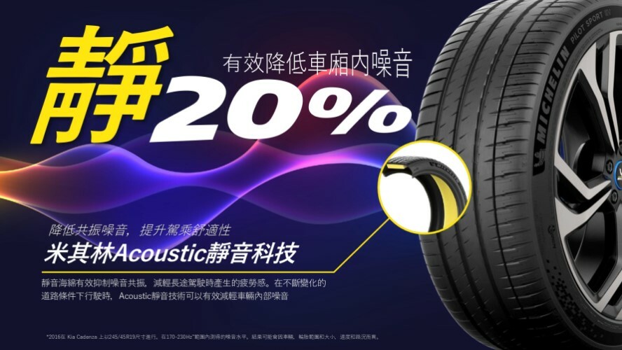 針對電動車少了內燃引擎,輪胎接觸路面所產生的噪音相對明顯,Michelin Pilot Sport EV 利用其獨家Acoustic靜音科技,以靜音海綿抑制噪音共振,有效降低約20%車廂内的噪音,減輕長途駕駛時產生的疲勞感,帶給電動車主及乘客更舒適寧靜的乘坐體驗。